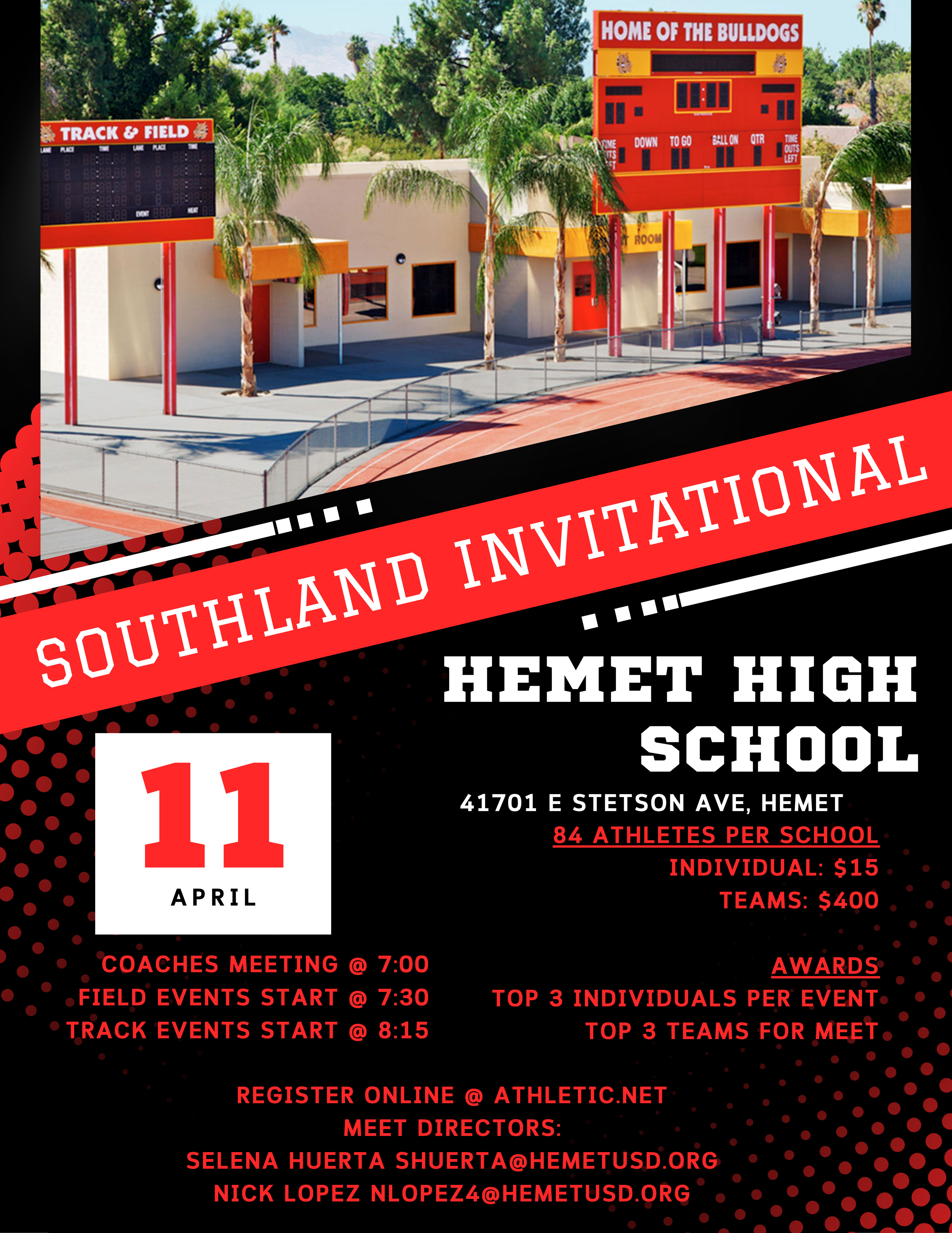 Southland Invitational Hemet 04/11/2026 Event Info 2026 Meet Flyer2026 Meet Information Results Live Results